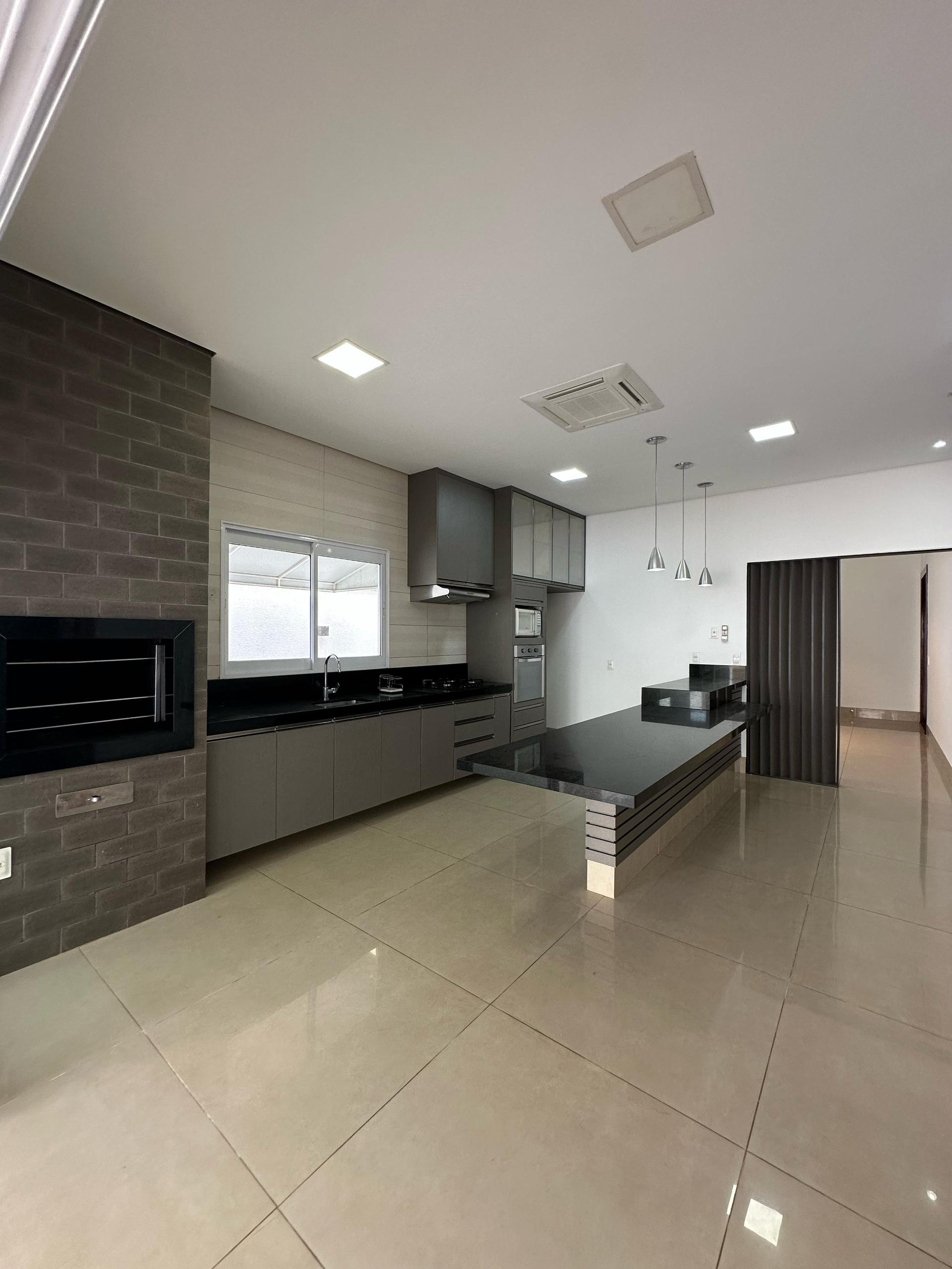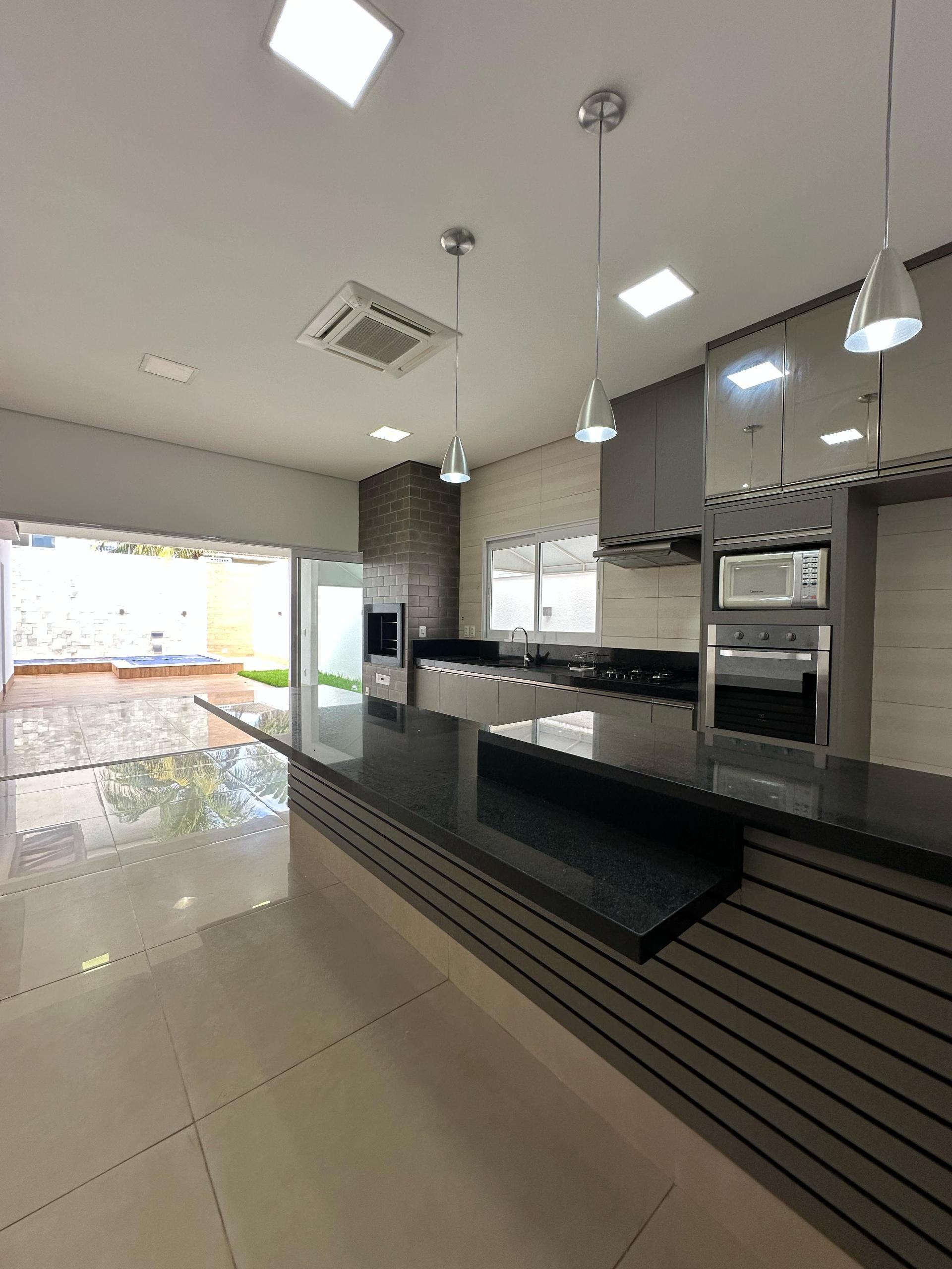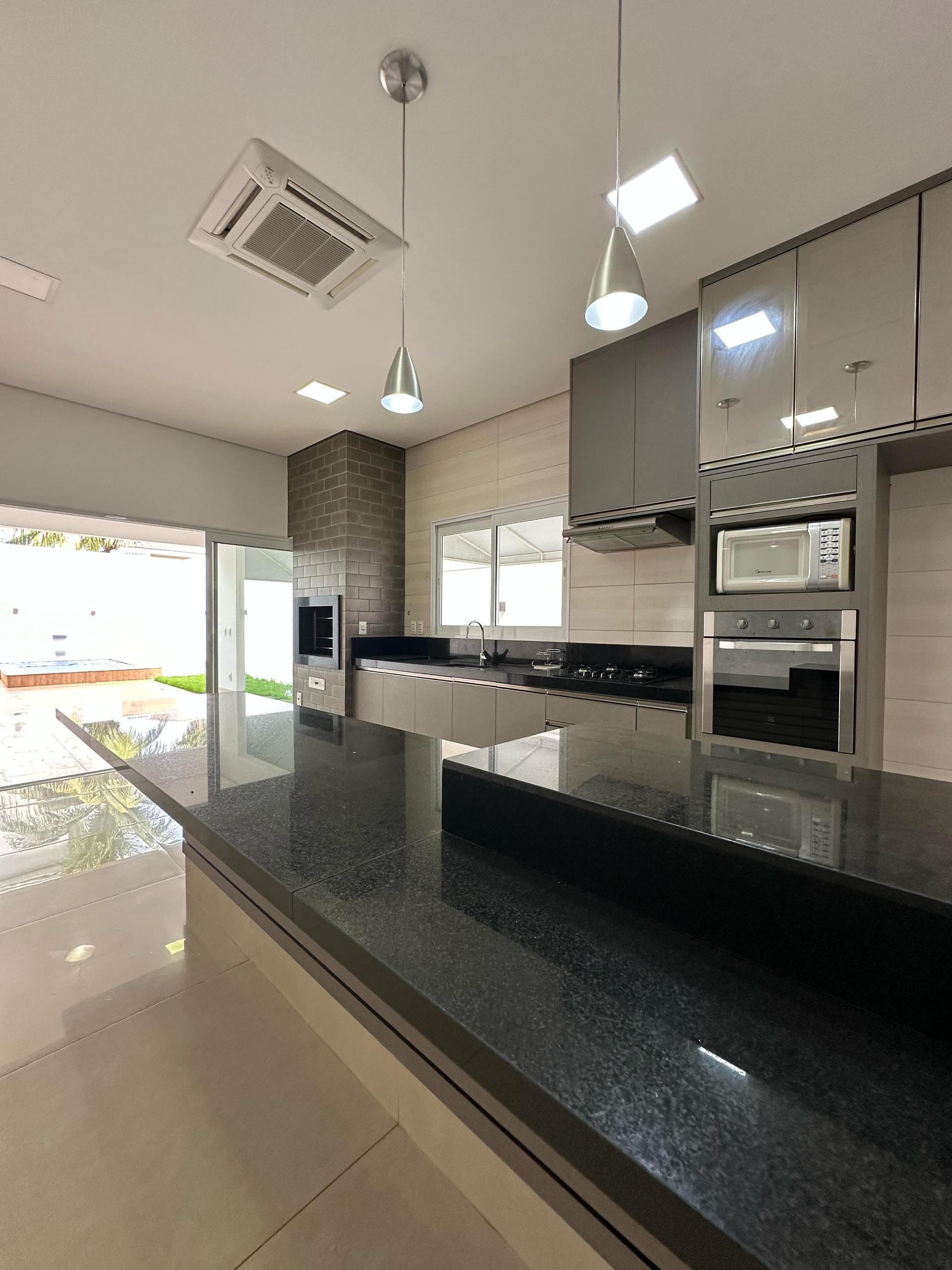 A área social é composta por uma ampla sala de estar com pé direito elevado, totalmente equipada com móveis planejados e cortinas, proporcionando sofisticação e conforto. A cozinha gourmet é completa, com planejados, churrasqueira, ilha em granito preto São Gabriel, além de cooktop, forno a gás, micro-ondas e depurador.