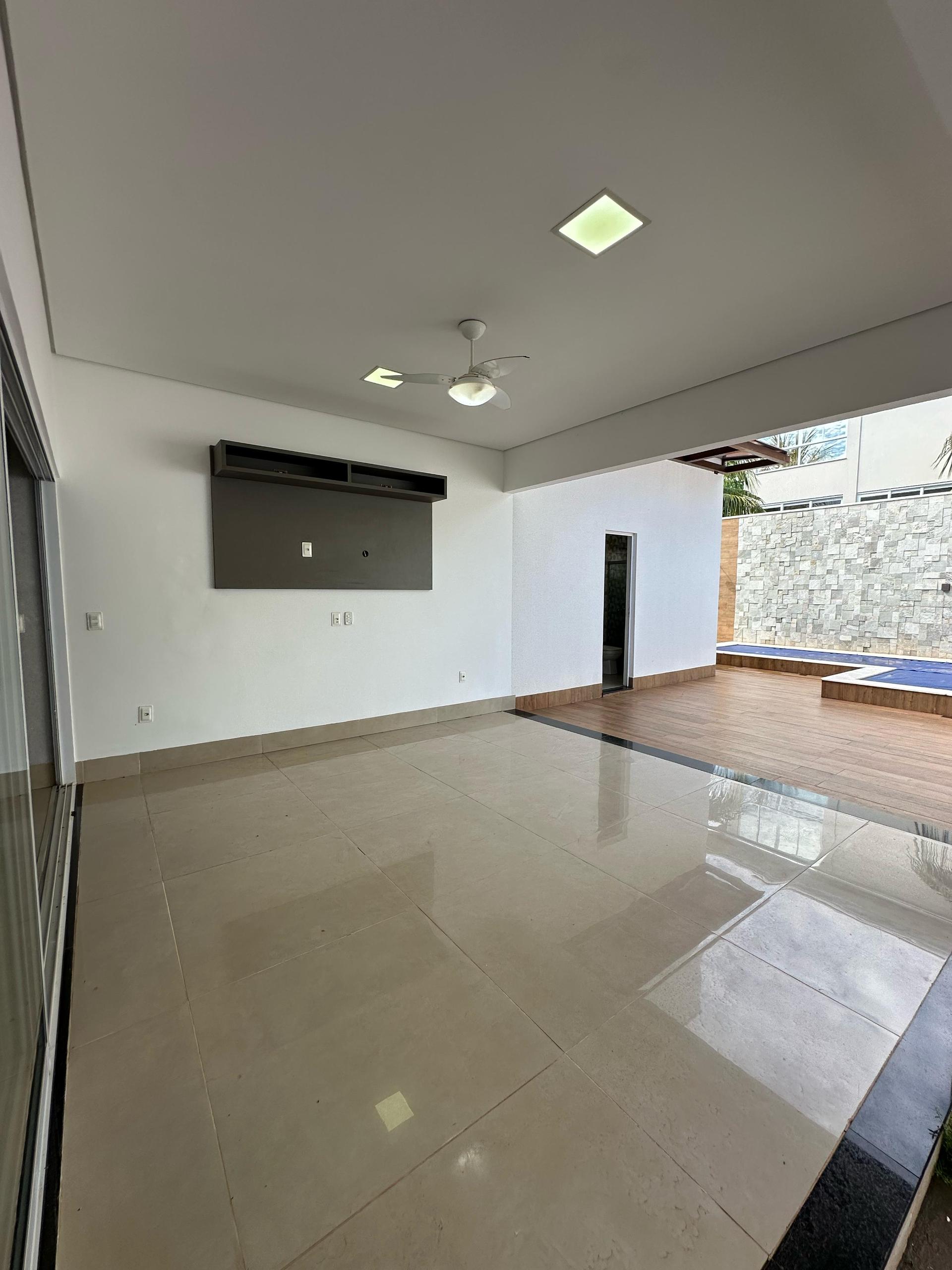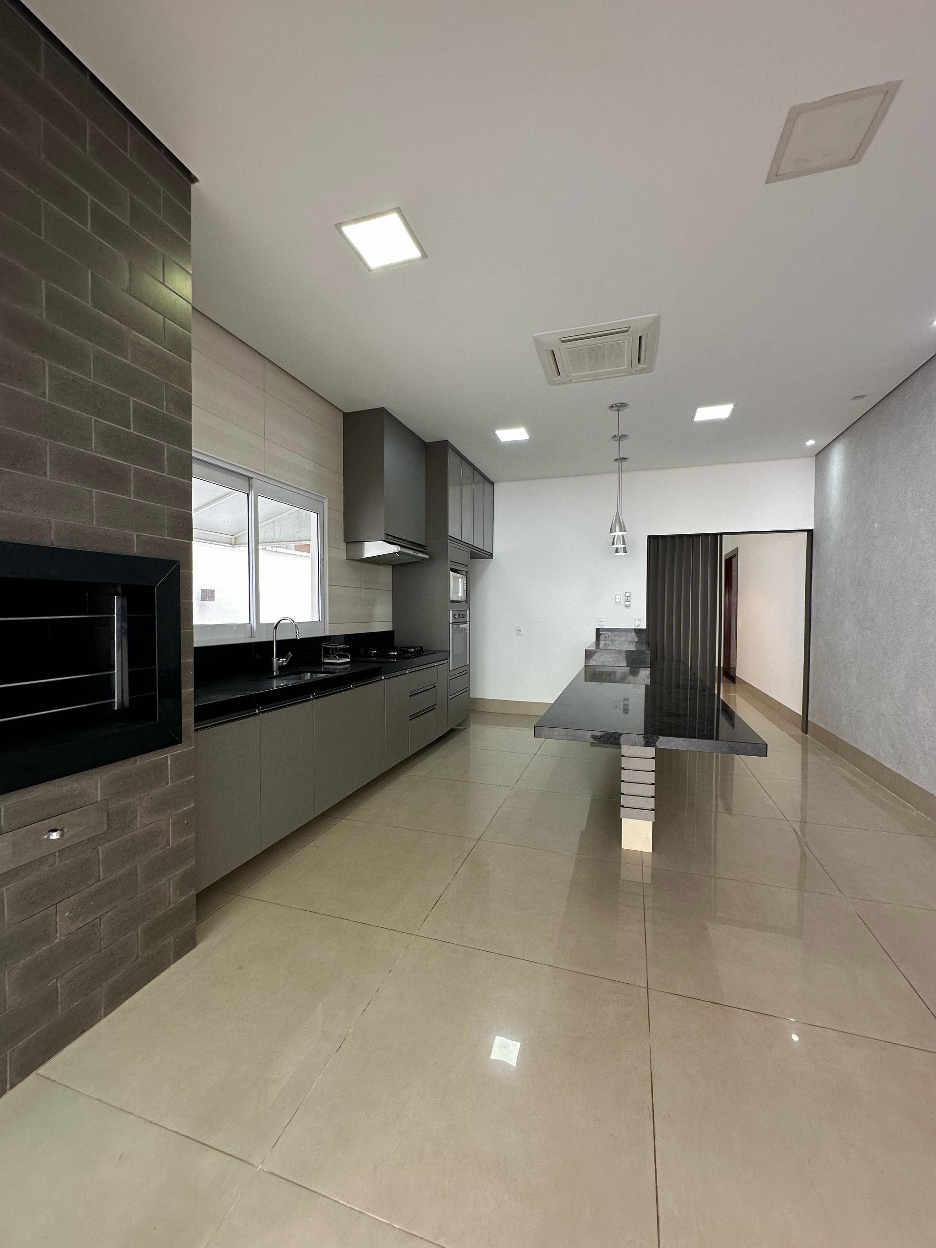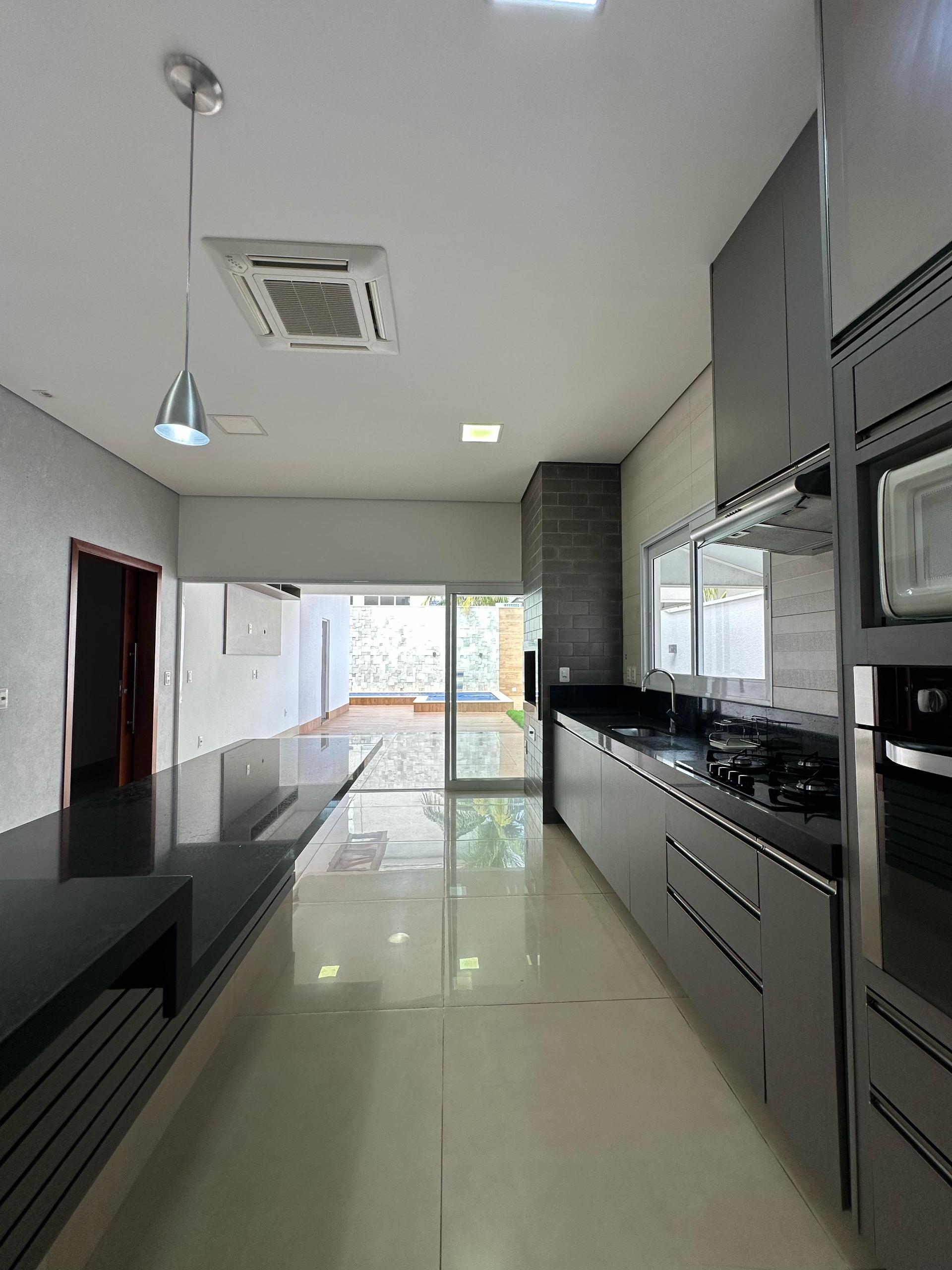 A área social é composta por uma ampla sala de estar com pé direito elevado, totalmente equipada com móveis planejados e cortinas, proporcionando sofisticação e conforto. A cozinha gourmet é completa, com planejados, churrasqueira, ilha em granito preto São Gabriel, além de cooktop, forno a gás, micro-ondas e depurador.